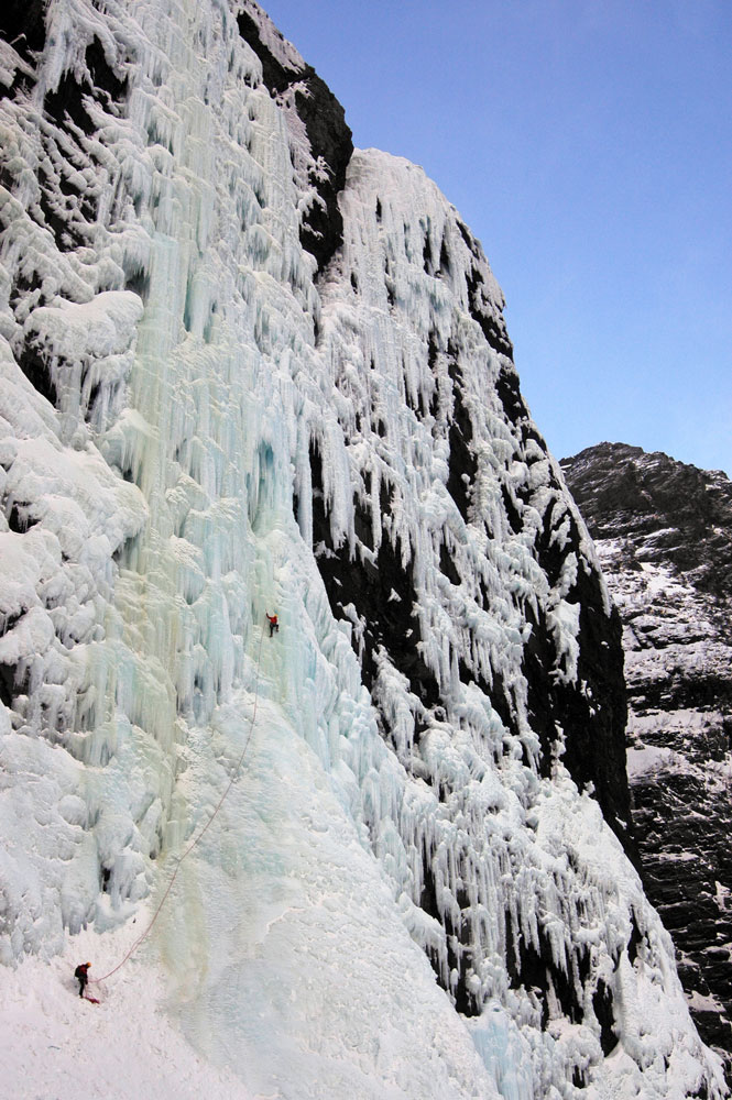 Splendida giornata, anche se fredda, su *Hydnefossen* (180 m, III/6) insieme ad Anna e Marco. Sicuramente è la cascata più appariscente di Hemsedal, con il suo caratteristico muro costantemente verticale, alto 180 metri e largo 150 metri! È possibile salire lungo più linee; noi abbiamo scelto quella centrale (4 tiri). Ottime condizioni generali.
